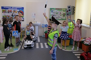 Кабинет оснащён макетом проезжей части, детскими электромобилями и всеми видами дорожных знаков, а также учебными светофорами. С помощью всего этого дети могут решать сложные логические задачи по безопасности дорожного движения, отрабатывать навыки безопасного перехода проезжей части на перекрёстке.