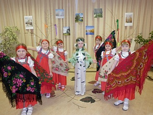 Педагог: Да, ребята, берёза действительно является символом России. Ни в одной стране мира нет столько берёз, как у нас. Со времён глубокой старины вошла в нашу жизнь берёзка. Она растёт во всех уголках нашей необъятной страны. Её можно встретить даже в тех местах, которые кажутся непригодными для роста растительности. Берёза растёт даже на карнизах старых каменных домов. Любит наш народ зелёную красавицу. Прислушайтесь, кажется, к нам кто-то идёт. (Под русскую народную музыку входит берёзка. Поёт песенку.)