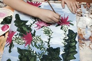 Раздаточный материал: бумага формата А3 для акварели плотностью 200 г/м2; наборы гуаши 12 цветов; палитры; кисти - щетина плоская № 3, белка круглая №№ 2, 3; ёмкости с водой; салфетки.