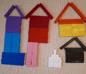 Описание. Рассыпаем перед ребёнком набор из цветных палочек, их должно быть 10. Предлагаем ему построить лесенку, размещая последовательно брусочки от самого маленького к самому большому. Когда лесенка будет готова, можно предложить малышу переместить зайчика снизу-вверх по лесенке. Далее можно усложнить задачу, предложив ребёнку сложить двойную лесенку уже из 20 брусочков (каждого размера по 2 штуки). Цветные палочки можно использовать и для занятий по конструированию.
