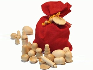 Кроме того, я использую готовый комплект «Чудесный мешочек» Вальда. Он состоит из 15 пар токарных фигурок (всего 30 штук) и хлопчатобумажного мешочка. Фигурки изготовлены из древесины, их размер 3–4 см. Сами фигурки — это реальные предметы — ёлки, жёлуди, чугунки, матрёшки и т.д. Сделаны они из однородного материала, что позволяет ребёнку фиксировать внимание не на текстуре, а на форме предметов.