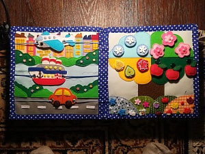 Назначение: изучение видов транспорта (наземный, водный, воздушный), его характеристики, количественный и порядковый счёт, развивать умение составлять описательный рассказ предмета, учить называть части предметов. Можно попросить ребёнка назвать представленные в книжке виды транспорта, что он делает (машина едет, самолёт летит) и для чего он нужен (перевозит груз, пассажиров). Спросить, какой ещё транспорт он знает. Ребёнок может двигать весь транспорт. Можно посчитать цветочки и домики.Материал: фетр, люверсы (оформление отверстий), пуговицы, сутажный шнур.