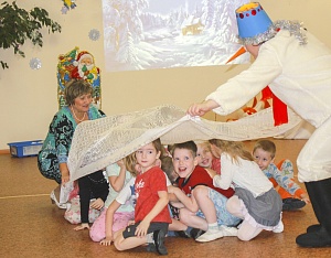 Снеговик: Ура, мы выполнили все просьбы Деда Мороза. Вы большие молодцы! А теперь предлагаю поиграть. (Звучит любая плавная музыка, дети, как снежинки, летают. Как только музыка заканчивается, Снеговик и ведущий поднимают белое покрывало, и дети прячутся под него.)