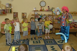 Материалы и оборудование: костюм клоуна для взрослого, магнитофон, диск с музыкой, воздушные надувные шары (круглые и длинные) — по 30 штук.