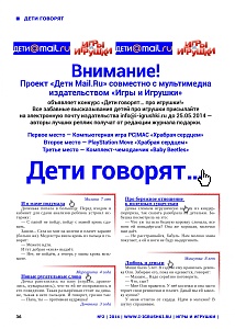 Проект «Дети Mail.Ru» совместно с мультимедиа издательством «Игры и Игрушки» объявляет конкурс «Дети говорят… про игрушки!».Все забавные высказывания детей про игрушки присылайте на электронную почту издательства info@i-igrushki.ru до 25.05.2014 — авторы лучших реплик получат от редакции журнала подарки: