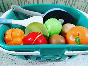Изготовлена кухня из качественных материалов. Кухня довольно яркая, вызывает интерес у ребёнка. Выполнена в реалистичном дизайне, включает множество аксессуаров. В комплекте имеется игрушечная посуда: сковорода, кастрюля с крышкой, тарелки, стакан, столовые приборы, салатница, перечница, солонка, сахарница, а также набор игрушечных продуктов. В дополнение мы докупили корзинку с овощами и фруктами на липучках, которые можно разрезать на дощечке, что способствует развитию мелкой моторики и ловкости рук. А яркие цвета и реалистичные формы не уступают по своему виду настоящим. Игра с таким набором помогает сформировать представление о продуктах, сортировать их на группы, способствует развитию фантазии.