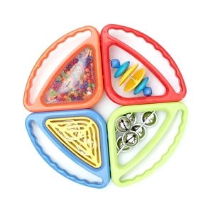 Бубен-трансформер состоит из 4 частей треугольной формы разных цветов. Каждая часть имеет удобную ручку для захвата и своё звуковое наполнение. Все части бубна съёмные и их можно соединить между собой в целую конструкцию.