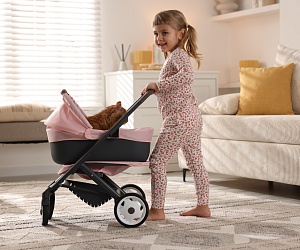 После двух-трёх лет игра усложняется, возникает потребность в новых предметах. К примеру, с помощью игрушечной посуды можно устраивать чаепития. Это не просто забава, но и полезный урок. Развивается мелкая моторика, малыш получает представление об объёме: учится наливать жидкость, вовремя останавливаясь. Ещё один предмет, который используется в игре примерно с того же возраста, — коляска. Прогулки с игрушечной коляской улучшают крупную моторику ребёнка, развивают ловкость, ведь ему приходится делать повороты, спускаться и подниматься.