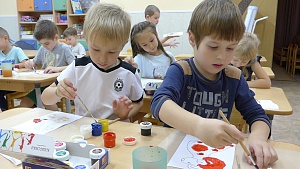 Воспитатель: Какие вы молодцы! Теперь смело можно приступать к работе. Наша мастерская по росписи дымковской игрушки открывается. Удачи вам, маленькие мастера! (Дети приступают к работе. В это время тихо играет русская народная музыка. В процессе работы воспитатель напоминает, что чем меньше разводить краску, тем насыщеннее будет цвет; необходимо помнить о правильном положении руки; о том, что во время работы надо поочерёдно использовать и тонкую, и более толстую кисть; необходимо хорошо промывать кисточку и класть её на подставку.)