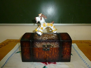 Воспитатель. Дети, посмотрите, какой чудесный сундучок! А что же в нём? Давайте откроем его. Козлик! Да какой нарядный! Вот как вертится — хочет плясать и стихотворение про себя рассказывать. А кто из вас знает потешки про козлика? (Обращаясь к дымковской игрушке, дети рассказывают потешки.)