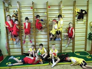 Не только вы любите полакомиться, но и обезьянки тоже, да вот только две из них не удержались и свалились с пальмы, поранились. Помогите им, отнесите в безопасное место. Лучше это делать вдвоём.Двое детей переносят на носилках мягкую игрушку, обезьянку, и передают её следующей паре.