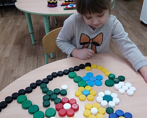 Сначала крышки дети использовали как элементы мозаики. В игре «Сложи узор» они выкладывали простые рисунки на столе или на полу сначала по образцу, а затем и по своему замыслу. Постепенно узоры стали сложнее, и дошкольники с интересом фантазировали, создавая их, а затем мы вместе перенесли рисунки на схемы. Также охотно дети выкладывают из крышек разного цвета ма̀ндалы.