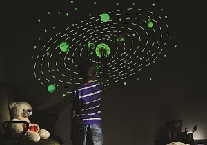 — Виниловые наклейки «Солнечная система», которые днём выглядят как настоящие цветные планеты, а ночью светятся зеленоватым светом. Они легко наклеиваются и снимаются с любой плотной поверхности, выглядят очень реалистично и подойдут к любому дизайну детской комнаты.