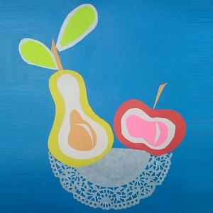 Учитель: Вот такую «фруктовую», яркую, аппетитную тарелку мы сделаем с помощью аппликации как подарок маме к празднику. Для начала работы нам понадобится лист бумаги тёмного оттенка (синий, коричневый, бордовый). На нём с помощью половины ажурной салфетки нам необходимо выделить плоскость стола. Ведь все фрукты у нас должны лежать или стоять именно на столе. Приклеиваем половинку салфетки внизу листа. Учтите, чтобы натюрморт получился красивым, фрукты должны быть разными по высоте. Фруктам надо удобно расположиться на листе, им не должно быть тесно, и в то же время они не должны быть слишком маленькими. Обратите внимание, что фрукты в натюрморте у нас выполнены не одним цветом, а тремя. Для груши мы выбрали три цвета бумаги: жёлтую, белую и оранжевую. Это позволит сделать фрукты в натюрморте более объёмными. В своей работе вы так же должны будете подобрать подходящие для вашего фрукта цвета. Какие ещё сочетания можно использовать для груши?