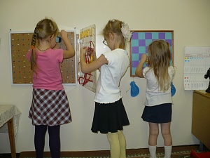 Многие пособия в нашей группе мы делаем собственными руками, и они вызывают не меньший интерес у наших воспитанников, чем покупные. Большую помощь в коррекционной работе по развитию у детей тонкой моторики, тактильной чувствительности, умению ориентироваться оказывают настенные коррекционные модули. При работе с этими тренажёрами учитывается острота зрения, индивидуальные особенности ребёнка, его темперамент, настроение, состояние нервной системы. Перед использованием тренажёров для снятия моторной напряжённости мышц рук, развития гибкости и подвижности пальцев проводится пальчиковая гимнастика.