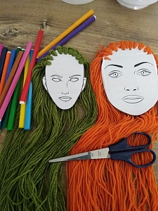 Берём пряжу (желательно потолще) любого понравившегося цвета и продеваем её сквозь отверстия, завязывая в узлы. Лучше всего продевать сразу несколько нитей – штук 5 или 6, чтобы причёска получилась пышной, и ребёнку было интереснее с ней играть. Собственно, модель для визажа и причёсок готова! Теперь «волосы» модели можно стричь, заплетать в хвосты и косы, пробовать делать уже известные причёски, или придумывать и создавать свои собственные. Сам шаблон лица можно раскрасить: глаза, губы, брови, сделать модели макияж.