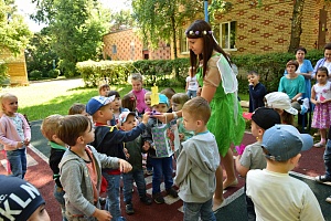 Лесные ягоды. Фея предлагает дошкольникам встать в круг на расстоянии двух шагов друг от друга и под весёлую музыку быстро передавать из рук в руки бутафорскую землянику из ткани. По звуковому сигналу дети несколько раз изменяют направление передачи ягоды. Иногда они стараются передавать ягоду очень быстро, поэтому она часто падает или перелетает над головами. Всё это является поводом для весёлого детского смеха. Затем Фея предлагает назвать лесные ягоды и демонстрирует их изображения на планшете. Дошкольники называют малину, землянику, ежевику, чернику, и помощью педагога - ягоды брусники и клюквы.