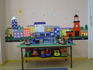 Также в группе оборудован специальный уголок игротеки для детей. В нём есть стол с полочкой для машинок разной классификации. Имеются снегопогрузчик, машина спасателей, поливомоечная машина, скорая помощь, патрульная машина, пожарная цистерна. Так же присутствуют грузовые и легковые машины. На столе расположена дорога с эстакадой, тротуары и зебры на дорогах. На стене из самоклеящейся бумаги мы создали город. Главное место в этом городе занимают срочные службы: пожарная, скорая и полиция. На этих домах указаны номера, по которым можно дозвониться в службы по сотовому телефону (к сожалению, не все взрослые знают, как правильно набрать номер). Особое место в уголке игротеки занимают стулья-машинки, имитирующие спецтранспорт: скорую, пожарную, ДПС. Я сшила чехлы на стулья в виде машинок. Пришила на спинку голубой квадрат в виде лобового стекла, впереди фары, сбоку колёса. Сзади, как и положено, — фары, номер машины, номер, по которому можно вызвать эту службу, и карман, в нём лежит руль (рули вырезали из фанеры и покрасили чёрной краской, пробовали пластмассовые, но они почему-то быстро у нас сломались). Ещё дополнительно сшила накидки для ребят: для пожарного — накидку и шапочку, для работника скорой — халат и шапочку, для сотрудника ДПС — накидку, приобрели также кепку и жезл.