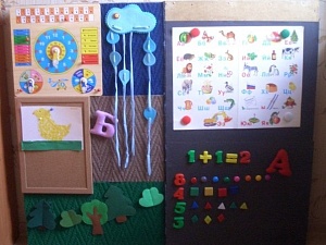Есть также пробковая доска, на которую можно прикрепить информацию по изучаемой теме или сделанную аппликацию, рисунок. Всё остальное пространство — ковролин (синий цвет — небо, бежевый — земля, зелёный — трава). На синем фоне можно менять погоду: солнышко, дождик, снег... На бежевом фоне можно прикрепить дерево. В зависимости от времени года добавить на полотно цветы, зелёные или жёлтые листики.