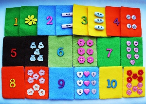 Для обучения счёту я сделала такие мягкие карточки из флиса (размер 6х8 см):Цифрам на обратной стороне соответствуют нашивки: 1 — один деревянный цветочек, 2 — две розовые длинные пуговки, 5 — пять пуговок в виде мишек. Самые разнообразные материалы использовались.
