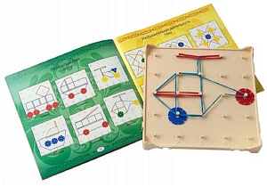 Цель: отработать количественный и порядковый счёт. По заданию взрослого ребёнок должен выложить на планшете нужное количество резиночек. При этом одна резиночка крепиться на один штырь - «овечка». Так же можно выкладывать определённую последовательность из резиночек разных цветов по инструкции взрослого.