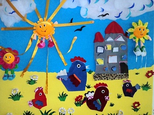 Этот уголок изготовлен аналогично предыдущему. Солнышко и цветочки — фабричные игрушки, прикреплённые к основе. Действия на этом игровом поле выглядят так: лучики солнышка прикрепляются пуговицами, окошки разной формы крепятся липучками к вышитым на домике контурам, шнурки на обуви завязываются. Курица, цыплята, маленькие цветочки, травка крепятся липучками и кнопками. Дети меняют их расположение на коврике, поют песенку «Вышла курочка гулять…», придумывают небольшие сказки. В процессе игр с ковриком у ребят происходит формирование элементарных математических представлений (знакомство с формой, величиной, цветом, направлениями).Коврики для игр за столом