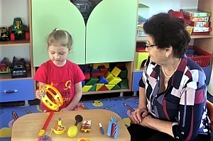 Для упражнений «Какая свистулька звучала», «Что за чем звучит» и других на дифференциацию игрушек с разным характером звучания размещаем в группе неваляшек, погремушки, мягкие кубики с вшитыми бубенцами, глиняные свистульки. Воспроизвести последовательность их звучания предлагаем детям сначала при опоре на зрительный анализатор, а затем только на слух.