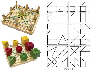 Попробуйте привлечь внимание ребёнка к рисункам/карточкам с изображением геометрических фигур и предложить повторить их на плоскости планшета с помощью резинок. Такое задание способствует осознанию связи между предметом и его изображением, учит использовать схемы для самостоятельного составления фигуры из частей. Всё это способствует развитию мыслительных операций сравнения, обобщения, группировки, а также логики и воображения. Примеры приведены на рис.12-й этап