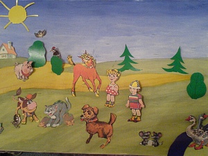 Цель: совершенствовать речевые умения, необходимые для построения текста повествовательного типа.Материал: панно, набор персонажей и различных деталей для составления композиции.