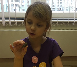 Малышу предлагаем катить шишку, горизонтально расположенную на руке, начиная с большого пальца по ладони до кисти и обратно. Все повторить с остальными пальцами (на правой руке, потом на левой).Шишку крепко я держу