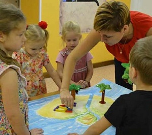 Психолог: Обезьянка тоже приготовила для нас задание. Перед вами – океан (лист ватмана, расположенный на другом столе). В центре океана – остров. А это то, что должно находиться на острове (психолог показывает детям предметы: высокая и низкая пальмы с бананами, высокая и низкая пальмы с кокосами, счётные палочки, синяя ленточка). Слева нужно построить жилище, используя палочки. Высокую пальму с бананами посадить справа, низкую пальму с кокосами – посередине. Между деревьями нужно расположить реку. (Психолог предлагает детям договориться, как они будут выполнять задание. Пока дети выполняют задания, логопед незаметно прячет сокровища в песок в таком количестве, чтобы каждому ребёнку хватило по несколько штук.)