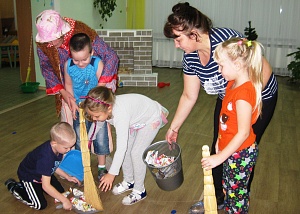 Кузя: Да, веник – это постель домового. Вот мы и поиграем с ним. (Игра «Ловкий дворник» (дворник – родитель). Для игры нужны веник и «мусор» (клочки газеты). Выбирается Дворник, который с веником становится в начерченный мелом круг. По сигналу игроки изображают «ветер» и кидают бумажки в круг, а Дворник выметает мусор. Дворник побеждает, если по истечении 1минуты в кругу не останется мусора.)