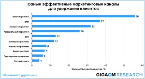 Рассылка может выполнить сразу несколько задач.Увеличить повторные продажи. Если человек купил один раз, это не значит, что он вернётся. Другое дело, если мы напоминаем о себе в рассылках, где даём подписчикам бонусы или спецпредложения. Исследователи из Gigaom попросили маркетологов оценить разные каналы диджитал-маркетинга по эффективности удержания клиентов. Email-маркетинг обогнал весь диджитал и оказался на 1-м месте.