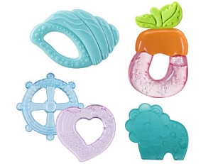 Полезная и выполняющая сразу несколько задач игрушка для первых месяцев – прорезыватель для зубов. Когда ребёнок немного подрастёт, прорезыватель можно будет использовать для массажа дёсен. Современные прорезыватели часто заполнены очищенной питьевой водой, что позволяет охлаждать прорезыватель – и холод слегка обезболит десны.
