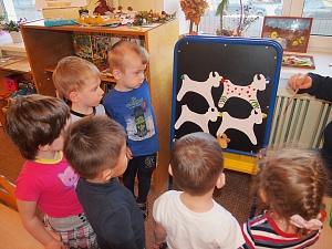 Дошкольникам поясняют, что коровка пригласила своих подружек на праздник, но они не хотят с ней идти, потому что не такие нарядные, как она. Внимание детей привлекают к силуэтам коровок на магнитной доске и отмечают, что все коровки-подружки белые, а игрушка нарядная, расписная.