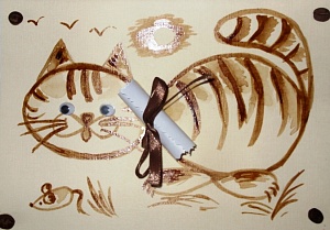 Я решила соединить использование кофе как нетрадиционного материала и нетрадиционного способа рисования животных с использованием цифры восемь. Так родилась тема занятия «Кофейные коты небывалой красоты». Дети самостоятельно выбирали уровень сложности своей работы. Например, глаза у кота можно было нарисовать, а можно было использовать готовые пластиковые глазки. Некоторые учащиеся повязали на шее кота бантик со свёрнутым в трубочку листком бумаги. В дальнейшем рисунки были использованы для изготовления открыток, и на листке написаны пожелания.