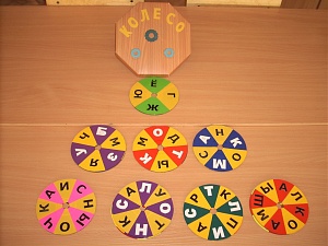 Игра «Колесо» выполнена на старых дисках (вместо дисков можно использовать старые пластинки, это позволяет увеличить количество секторов). Каждый диск разбит на сектора (4, 6, 8), это зависит от количества букв в словах, написанных на дисках. Например: на диске будут написаны слова из трёх букв (кот, дом). Значит, диск разбивается на 6 секторов. Три сектора — жёлтого цвета, три — зелёного (цвета можно выбирать любые по вашему желанию). На жёлтых секторах наклеиваются буквы (к, о, т), на зелёных — (д, о, м).