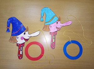 - Привяжем один край нитки мулине к носу Петрушки, а другой – к кольцу.