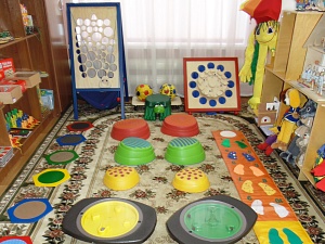 Зона оборудована следующими пособиями: «Доска на четырёх роликах», «Кочки на болоте», «Мяч на резинке», «Шагомобиль», «Черепаха», напольный «Шарик в лабиринте» «Сырный ломтик», «Сенсино», «Тактильные дорожки».