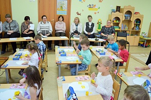 Воспитатель: Что есть внутри яблока? (Дети называют косточки.) Давайте нарисуем их кончиком кисточки в середине фрукта. Можно добавить и плодоножку, маленькую палочку сверху яблока. (Педагог демонстрируют слайд с изображением яблок в банке и показывает, как нарисовать косточки и плодоножку яблока.) Теперь уложим в банки ягоды смородины вместе с веточками (Педагог рисует веточки смородины восковым мелком, располагая их в банке то слева, то справа от яблок.) Ягоды удобно рисовать тычком, посмотрите. (Педагог напоминает приём рисования палочкой. Дети рисуют под музыкальное сопровождение. Когда рисунки готовы, воспитатель предлагает сделать крышки из салфеток разного цвета и закрепить их на банках при помощи резинок. Готовые работы дошкольники прикрепляют к доске с помощью магнитов.)