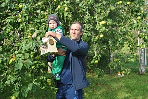 После обеда мы пошли с внуком в сад, и стали выбирать дерево, куда могли бы определить деревянную кормушку. Внучок предложил яблоню, я согласился и помог ему подвесить будущую «столовую для птиц». Я пообещал, что каждый раз, когда мы будем собираться на дачу, обязательно станем брать с собой корм для птичек, и они веселей переживут холодную зиму.