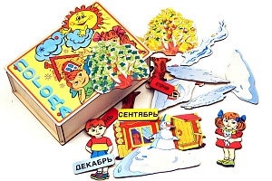 Круговое поле с месяцами снабжено специальной стрелкой и фигурами-вкладышами: дерево на поляне и домик. После того, как все месяцы нашли своё место в «году», помогите ребёнку установить стрелку на какой-нибудь месяц. Если выпало лето, нужно собрать новую мозаику – найти «летнее» дерево и «по-летнему» собрать домик. Зимой же на крыше домика лежит снег, и нужно найти все «зимние» части домика, собрать их в целую картинку.