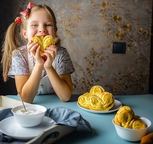 Необходимые ингредиенты: 200 мл молока, 500 грамм муки, 0,5 пакетика сухих дрожжей̆, 50 грамм сахара в тесто, 50 грамм сливочного масла, 2 яйца, 0,5 чайной ложки соли. Замешиваем дрожжевое тесто и ставит подняться. Через 1,5 часа нужно разделить тесто на равные части. Раскатать скалкой кружки, смазать немножко подсолнечным маслом и присыпать сахаром (масло и сахар берите на глаз и вкус). Накрыть кружок сверху чуть больше середины и снизу, сложить пополам, разрезать ножом почти до конца от сложенной середины, развернуть плюшку. Уложите их на пергамент, смазанный маслом. Дайте им немного времени для поднятия, затем выпекайте в разогретой духовке 35-40 минут при 180 градусах.(Маргарита Фуряева, г. Вологда)