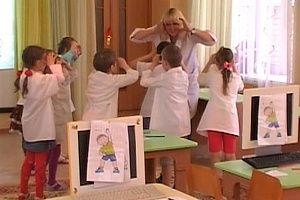Логопед: Отлично, теперь мы с вами — сотрудники лаборатории, предлагаю надеть специальную одежду. (Все надевают халаты.)