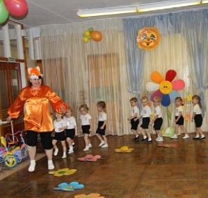 Воспитатель: Пошли, мои лисята, друг за другом. (Ходьба, перестроение по ориентирам – цветочкам.) Посмотрите, какие цветы, а сейчас каждый мой лисёнок встанет на свой цветочек. (Дети встают каждый на свой цветок.)