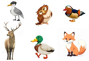 Слова: Волк, лиса, ёж, белка, лось, олень, медведь. Дятел, сорока, галка, глухарь, синица, голубь, снегирь, поползень, ворона, сорока, клёст. (Затем выставляются картинки диких животных и зимующих птиц на мольберт, в названии которых встретились отрабатываемые звуки.)