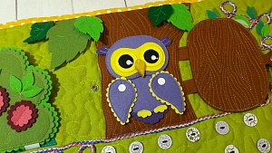 Рядом с малинником растёт огромное дерево, сверху на нём свисают резные листья, под которыми в игре или в процессе развития внимания можно прятать мелкие игрушки. Ствол дерева специально уплотнён и прошит для создания имитации коры. Это разнообразит ощущения ребёнка. По центру огромное дупло с овальной дверью, она закрывается на рубашечную кнопку. Открываем двери, а в дупле сидит добрый и мудрый филин. Его голова вращается на 360 градусов, это позволяет сделать вшитая магнитная кнопка. Крылышки тоже вращаются и крепятся на рубашечные кнопки. В процессе игры с филином ребёнка легко научить ориентировке в пространстве: вправо, влево. В развитии речи поможет детская потешка «Совушка-сова, большая голова». Самое тактильное и привлекательное в филине – это его клюв, обычная пуговка великолепно вписалась и добавила натуральности своему хозяину.