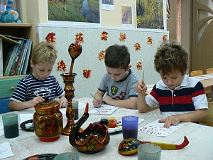 - Практические занятия по рисованию, включающие в себя освоение детьми элементов хохломской росписи и последующую работу по созданию узоров с соблюдением цветовой гаммы, мотива росписи и последовательности выполнения работы.