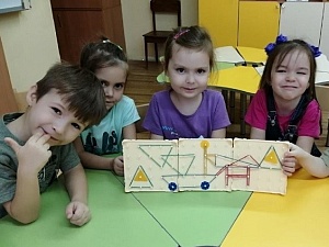 - «Оживление фигур», когда ребёнок на поле изображает квадрат или треугольник, а после этого с помощью резиночек и фигур дорисовывает их, то есть «оживляет».