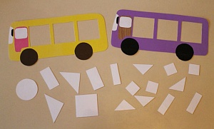 Воспитатель: Молодцы, ребята, как много видов транспорта вы знаете. Но поедем мы на том транспорте, изображение которого спрятано в ваших конвертах. Достаньте из конвертов геометрические фигуры и составьте из них пассажирский транспорт, который перевозит людей по дороге. Что это может быть? (Ответы детей. Ребята строят автобус из геометрических фигур.)